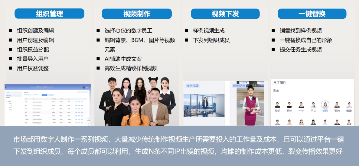 市場部用數字人制作一系列視頻,大量減少傳統制作視頻生產所需要投入的工作量及成本,且可以通過平臺一鍵下發到組織成員,每個成員都可以利用,生成N條不同IP出鏡的視頻,均攤的制作成本更低,裂變傳播效果更好。